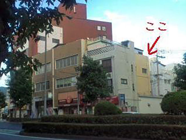 国道34号線越しに市役所方面からお店のあるブロックを見る。中央の黄色がかった小さなビルがお店のあるビル