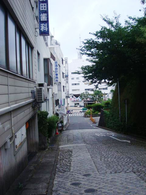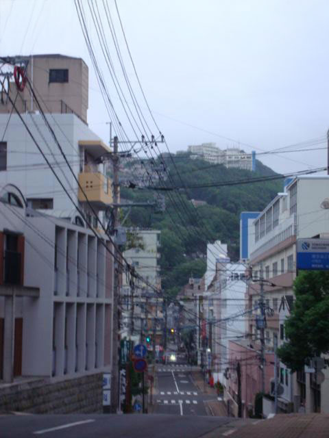 豊後坂(左の写真)と市役所との間あるつぶやき坂、中央奥にNBC長崎放送が見えます