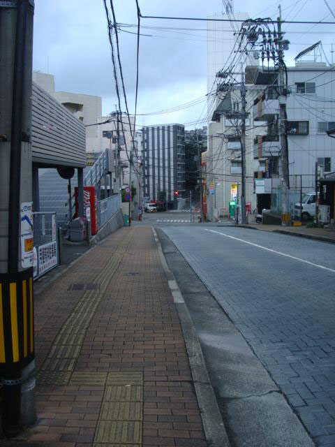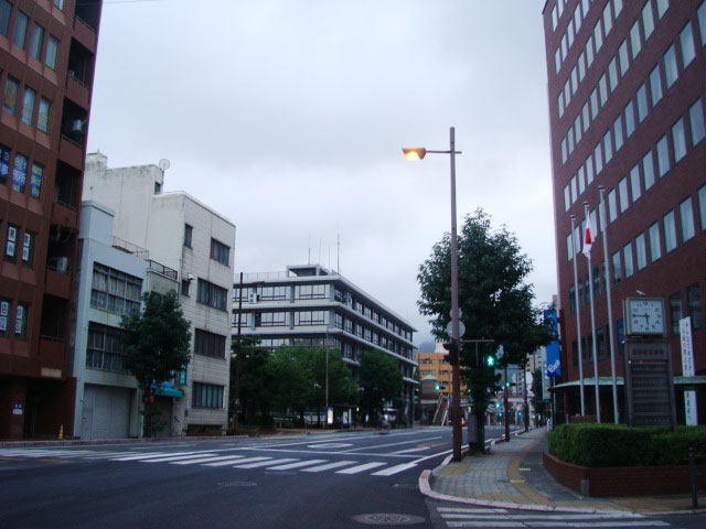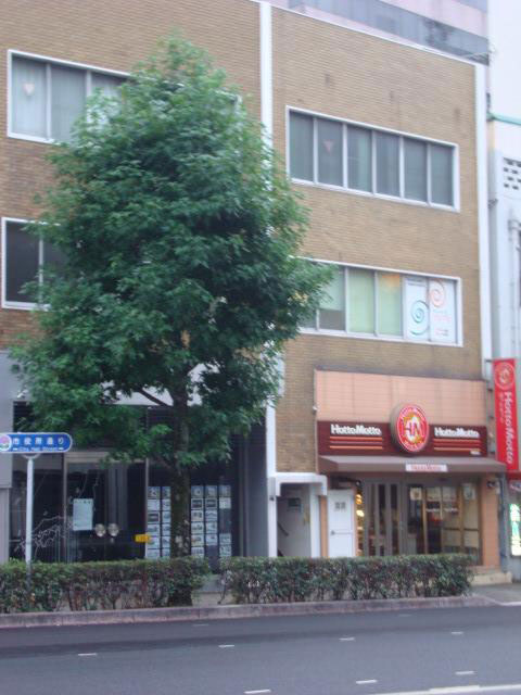 桜町交差点から眼鏡橋の方に30m程行くと右手の角に豊川稲荷の小さな祠があります。そこから県庁方面(南向き)の眺め、国道と平行に走っている裏通りに面してヤムヤムのお店があります。写真では右橋の中央に赤いフラグがあるとことがお店の入り口です。この通りに、地方裁判所、法務局、朝日新聞社等があります