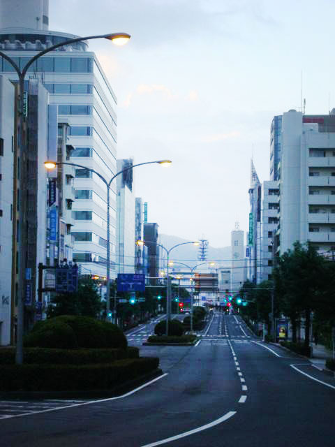 桜町交差点から眼鏡橋方面を望む坂は豊後坂、眼鏡橋はこの道を下って5ブロック先にかかっています。拡大すると眼鏡橋が見えます